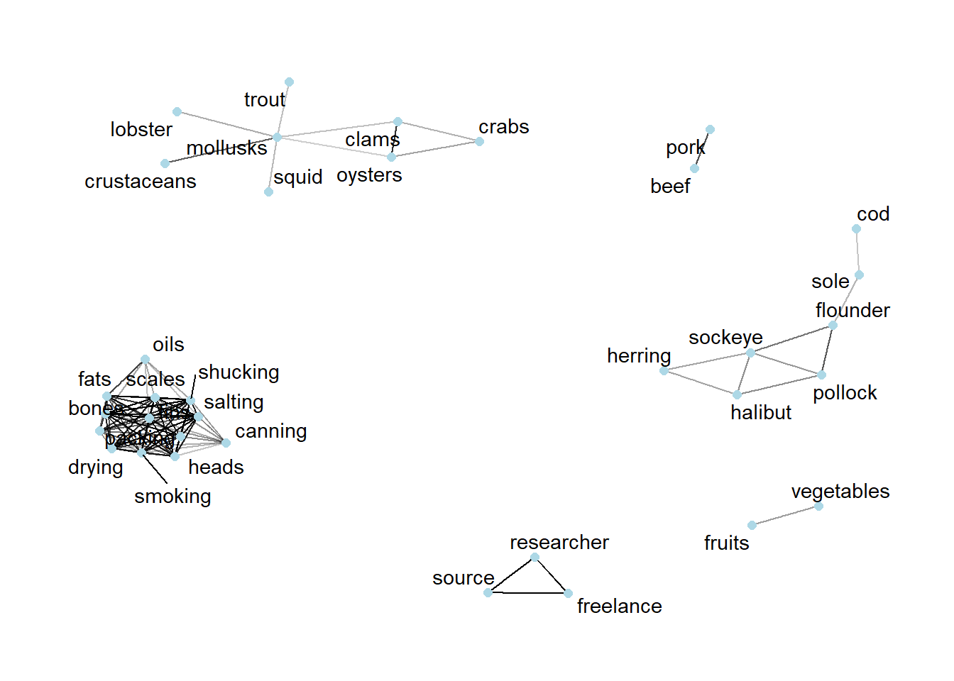The second largest group consist of mostly words that are different kinds of shellfish, such as "lobster", "oysters" and "clams". However, there are non-shellfish items in the group, such as "trout" and "squid".